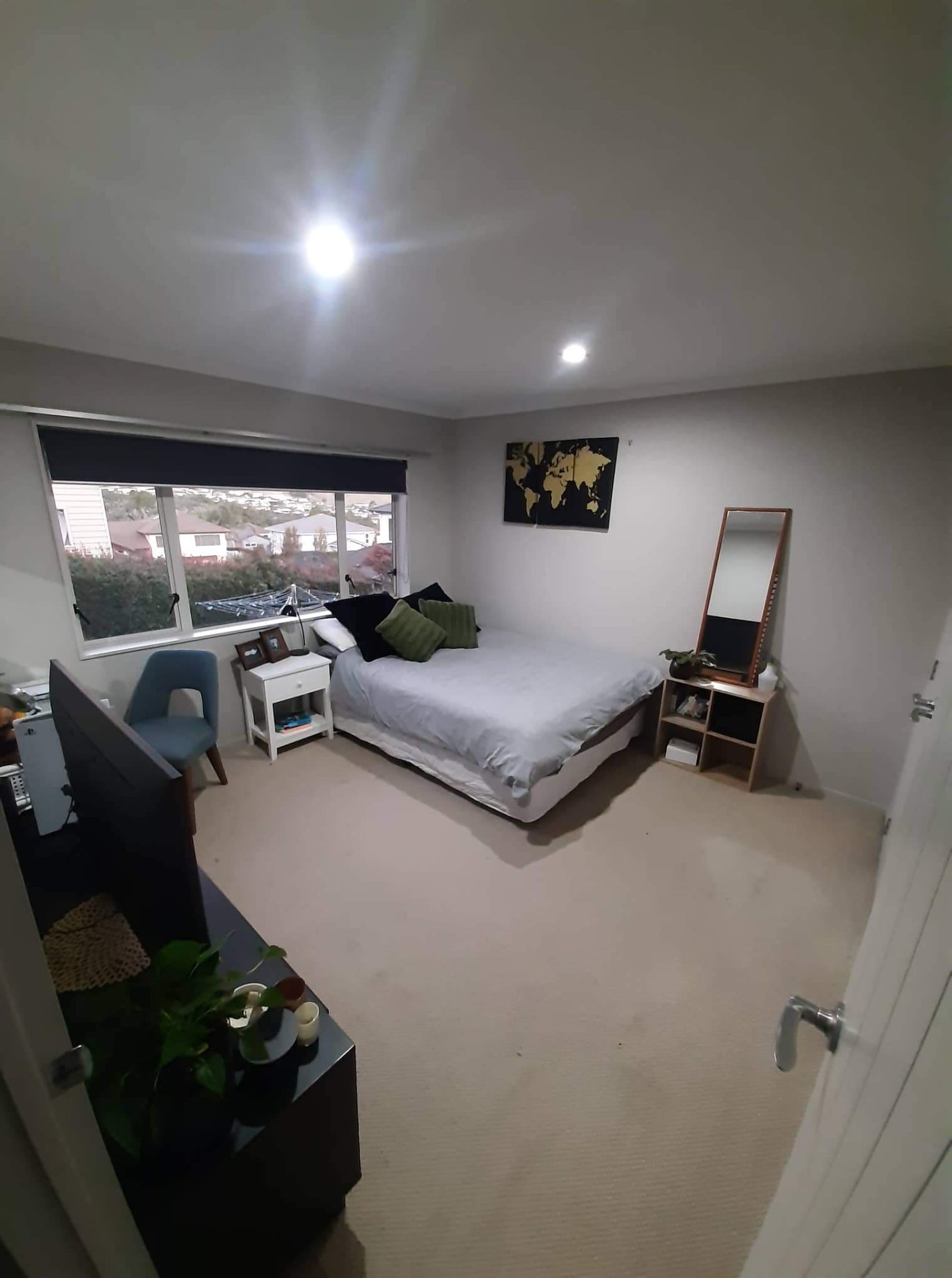 👉 Only room downstairs. It is slightly bigger, includes a built-in double wardrobe, comfortably fits a queen bed, drawers and desk. The current flatmate even fits a portable walking pad in there!